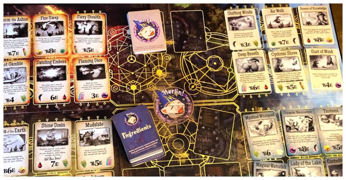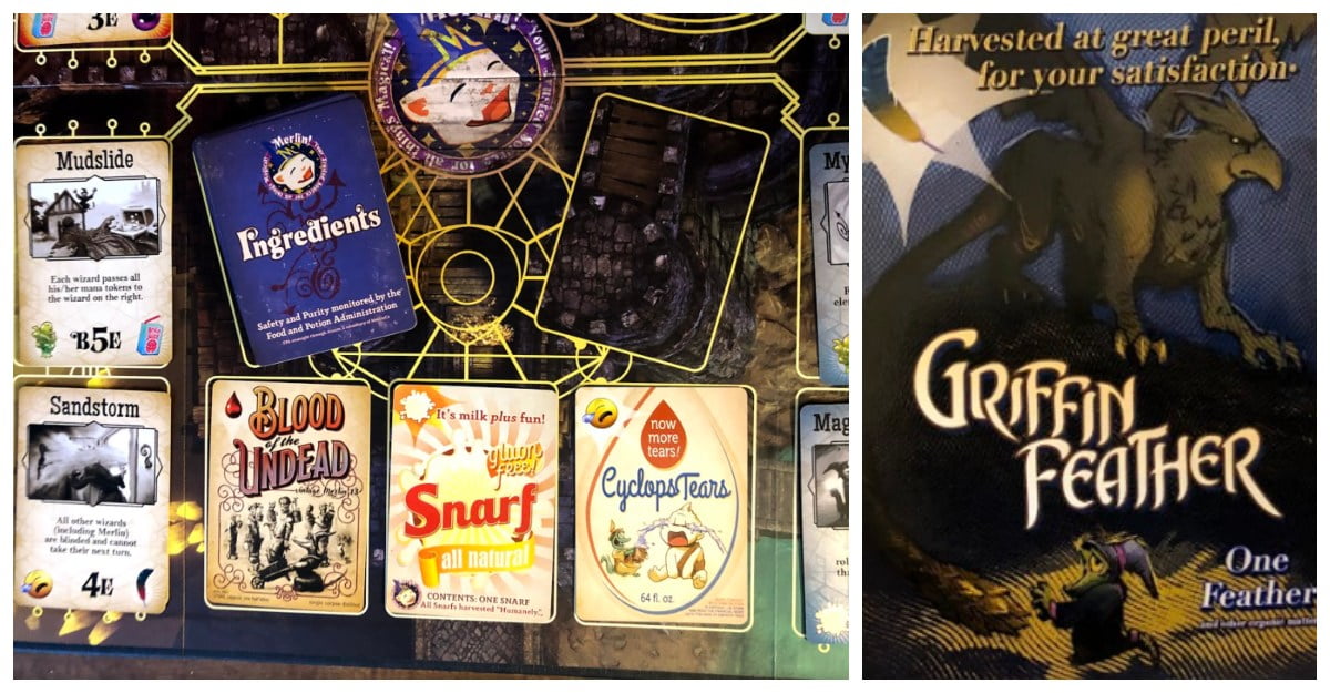 Ingredient Cards It’s a patriarchal, capitalist world we live in, so you will need to purchase ingredients from Merlin in order to defeat Merlin. You get to purchase up to three ingredients per turn but have a five-card hand limit. Blind picks are cheaper than revealed picks, and there is a wild card called a “Mimic” which can take the place of any ingredient.
