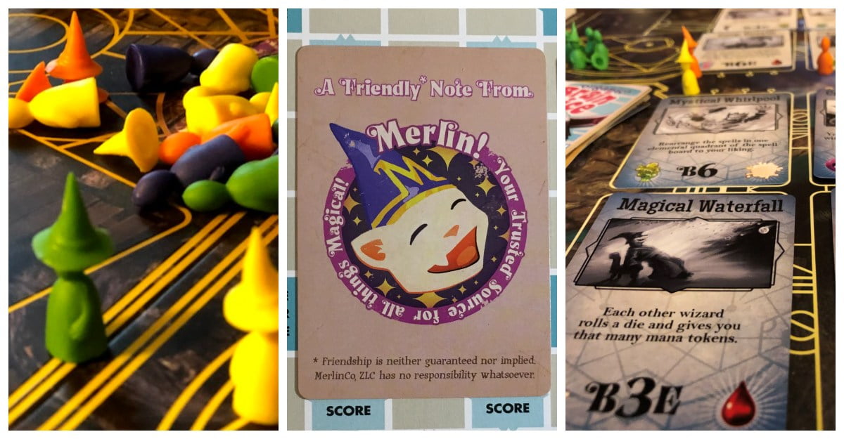 You win the game by learning the four spells, unique to your hand, that will defeat Merlin. You need to have a wizard pawn on each of the spells, though they do not need to be charged, and you need to have 20 mana tokens. When revealing your secret formula card, you must say “And with that, I have killed Merlin!” following which you may mock your opponents incessantly.