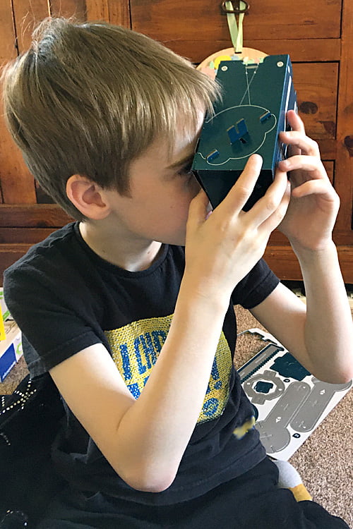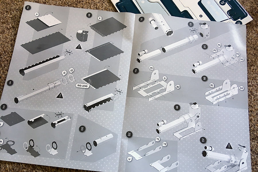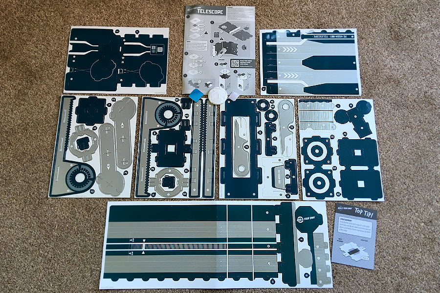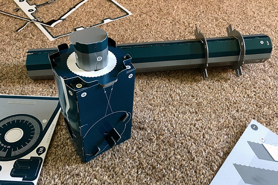 All the main components in this kit are made from cardboard and are ready to press out from their sheets without the need for scissors. The pieces are clearly labeled to make it easy to know which one to use next and are great quality – we didn’t have a single tear while building our telescope.