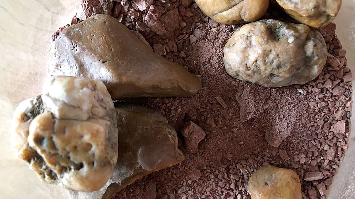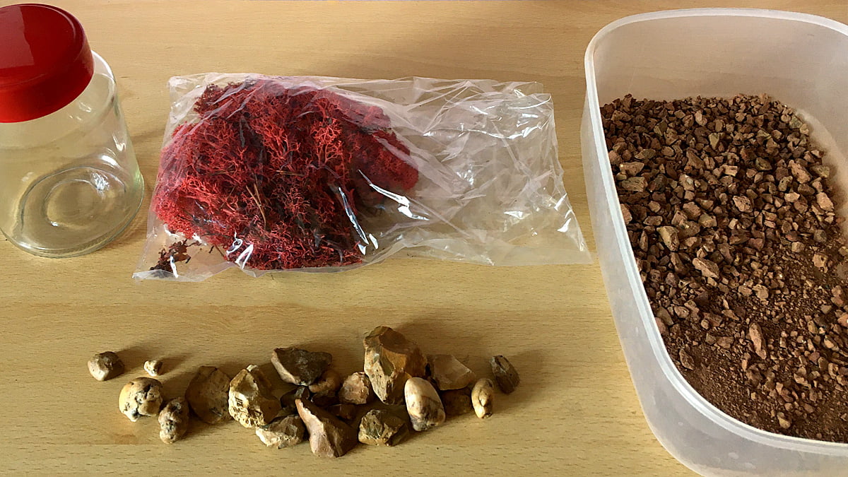 For my red dirt and rocks, I detoured one of our family’s lockdown walks to a nearby field with a public footpath running right through the middle of it. Here I was able to find plenty of small red rocks to bring home and a few pieces of an old, broken red clay pipe than had been smashed into chunks by a plow passing over it. Depending on where you live, you may find it easy to find red rocks and clay out and about in your local area while on a nature walk but if not, you can always pick up some red, fish tank gravel to serve as an alternative and use craft paint to paint some ordinary stones from your neighborhood red.