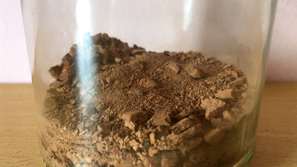 I began crafting my Mars Jar by smashing up the red pipe fragment into a coarse powder using a hammer – a task my ten-year-old tackled with gusto! Once it had been pummeled into a vaguely dirt-like texture, I added it to my cleaned out coffee jar and tapped it down until it compacted to form some reasonably solid ground.