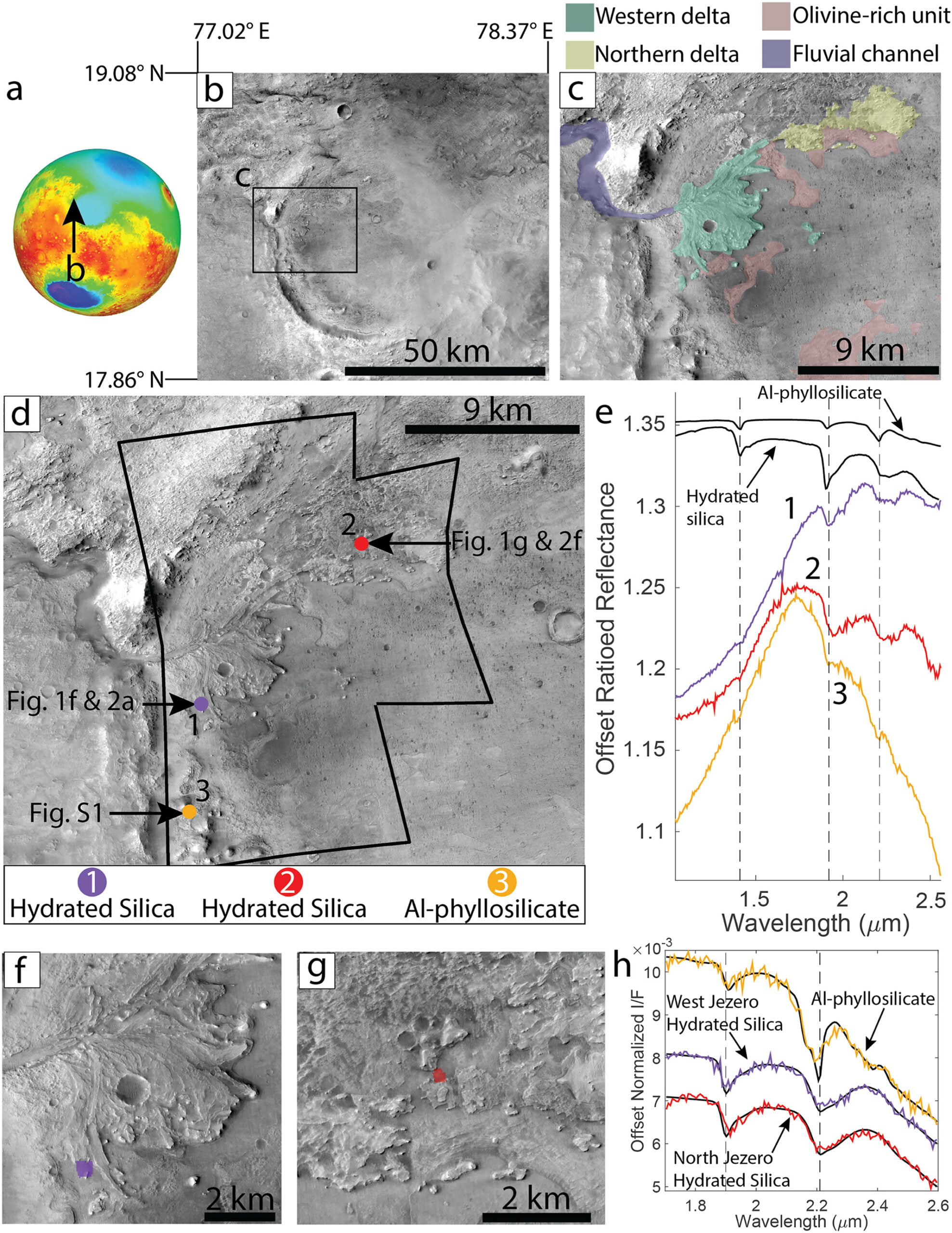 Tarnas, Mustard, Lin, et al. “Orbital identification of hydrated silica in Jezero crater, Mars.” Geophysical Research Letters. Nov 2019. https://agupubs.onlinelibrary.wiley.com/doi/abs/10.1029/2019GL085584