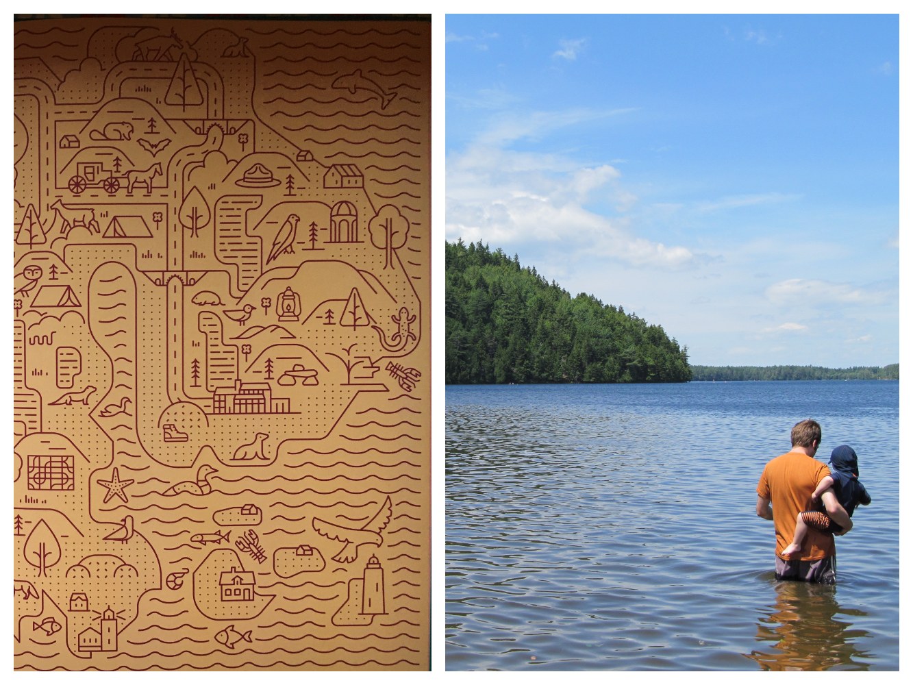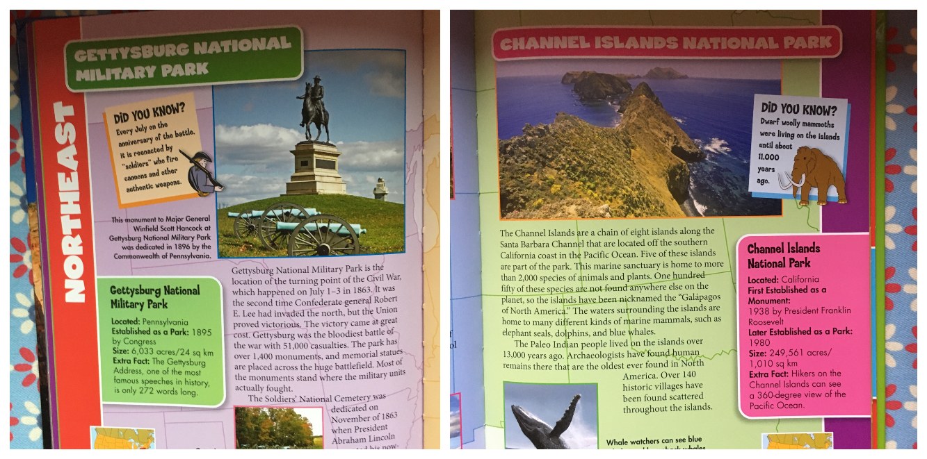 The second book we used as a companion to the informational guide was Seek and Find National Parks by Jorien Peterson. This covers nine of the parks—thankfully for us, Acadia was one of them—and offers you a chance to visit them virtually by providing a treasure map containing illustrations from the parks. Plants, animals, and landmarks are listed in a key for each park for you to find on the seek-and-find map. It’s like a Where’s Waldo experience for National Park enthusiasts. The artwork is beautiful and I am tempted to attempt to transfer one of the maps to a wall in our house where I was planning on hanging maps of the world. This book highlights what is unique about each park.