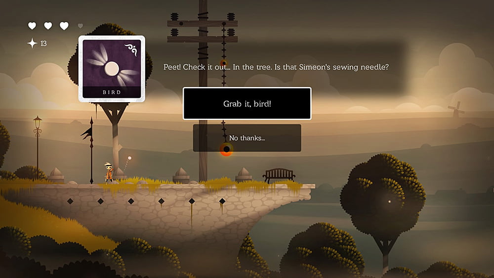 Right at the start of the game, you will find Bird. Bird is a small glowing companion who looks like a Golden Snitch and will follow you around for the rest of the game, much like Sparx in the Spyro games. At times, Bird will speak up offering their advice and opinions, and later on, they will help Peet solve puzzles by carrying objects for him. Considering the darkness of Neversong, both literally and metaphorically, having Bird along as your bright, glowing friend offers a much-needed morale boost at times.