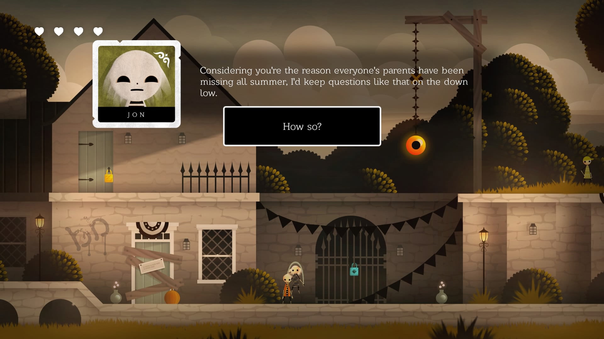 Speaking of monsters, Redwind is infested with them and you will need to fight off many as you play your way through Neversong. Many of them, like the little orange spider-like creatures that skitter about on the ground, are easy enough to kill with a solid whack from your baseball bat. As you progress, harder and harder monsters will begin to appear, occasionally trapping Peet in one spot until he defeats them all. You’ll begin with four lives – indicated by heart symbols in the top left-hand corner of your screen – but can earn more by collecting 100 Stars from defeated monsters. By the end of the game, I had around eight or nine lives which were hugely beneficial when it came to defeating boss monsters.