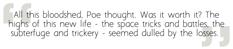 And then there’s Zorii Wynn, a teenage girl who forms part of the team Poe met on Yavin 4. Zorii seems wise beyond her years and the rest of the hard-boiled crew are oddly protective of her despite her obvious lack of experience. As Poe and Zorii’s relationship develops, he finds it increasingly difficult to walk away from the Spice Runners, even as their missions become darker and ever more deadly, forcing Poe into moral choices that often turn his stomach.