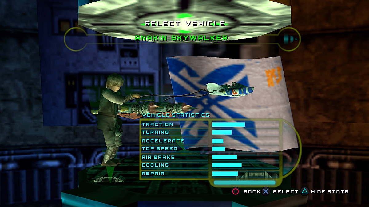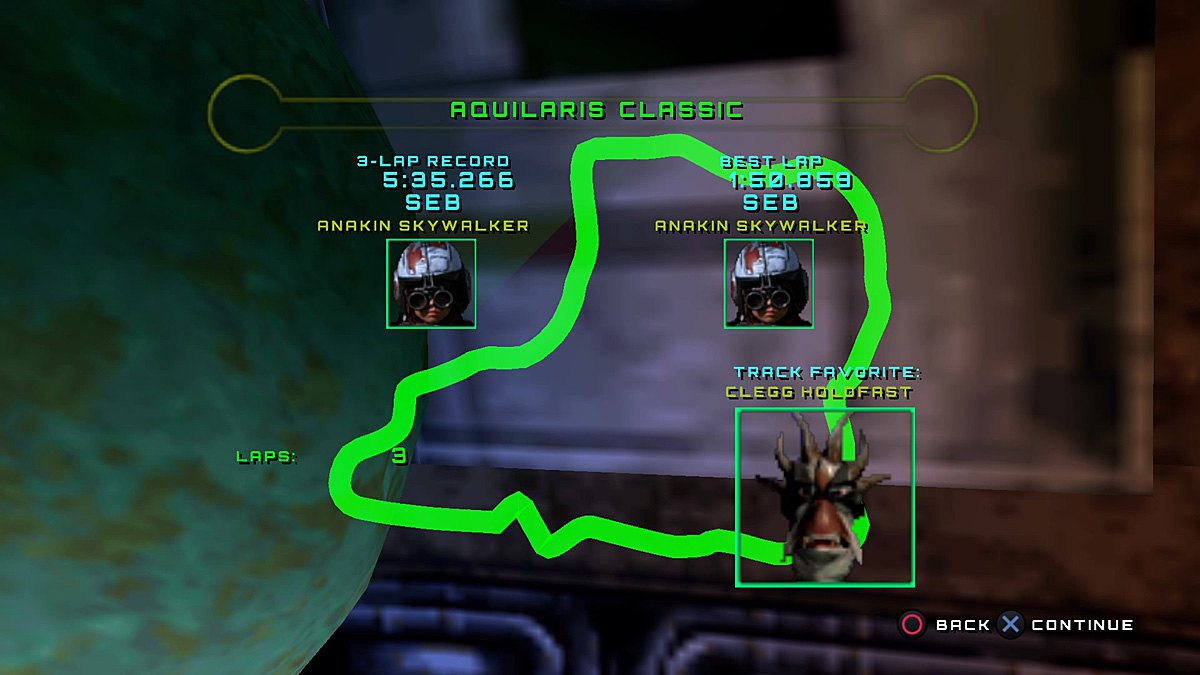 Once you’ve picked your competitor and pod, you can choose a track. There are three Podracing Circuits: Amateur, Semi-Pro, and Galactic, and these increase in difficulty as you would expect. All three circuits contain seven tracks across planets including Baroonda and Malastare that you have to unlock in order. The first track available in the Amateur Circuit is the Boonta Training Course from The Phantom Menace and this is a great place to start. Once you’ve selected your racer and track you can choose to start the race or inspect your vehicle first. When you start the race, you’ll first get to see some scenic shots of the planet and track area itself with commentary from Fode and Beed, the same two-headed character who commentated in The Phantom Menace.