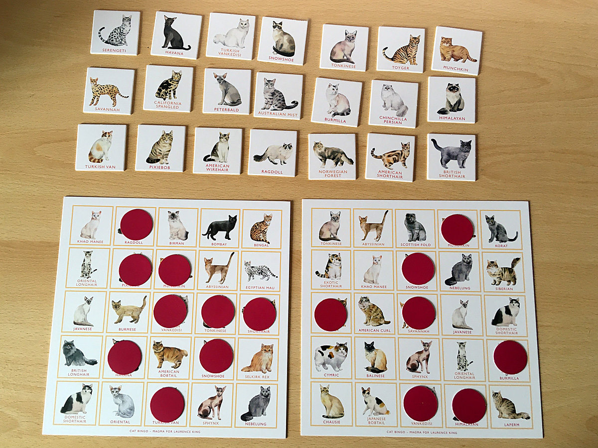 The game itself is very simple. One person acts as the bingo caller and has the large playing board in front of them along with the bag of cat tokens. All other players (up to 12) have a bingo card in front of them and a number of counters. The caller reaches into the bag and pulls out one token at a time, reading out the cat breed it shows and showing the token to the players. The caller then places the token onto the correct space on the board and any player who has that breed on their bingo card places a counter on top of it. The first player to either cover their entire bingo card in counters or fill a straight line either horizontally or vertically (you’ll need to decide on the win criteria before starting a game) is the winner.