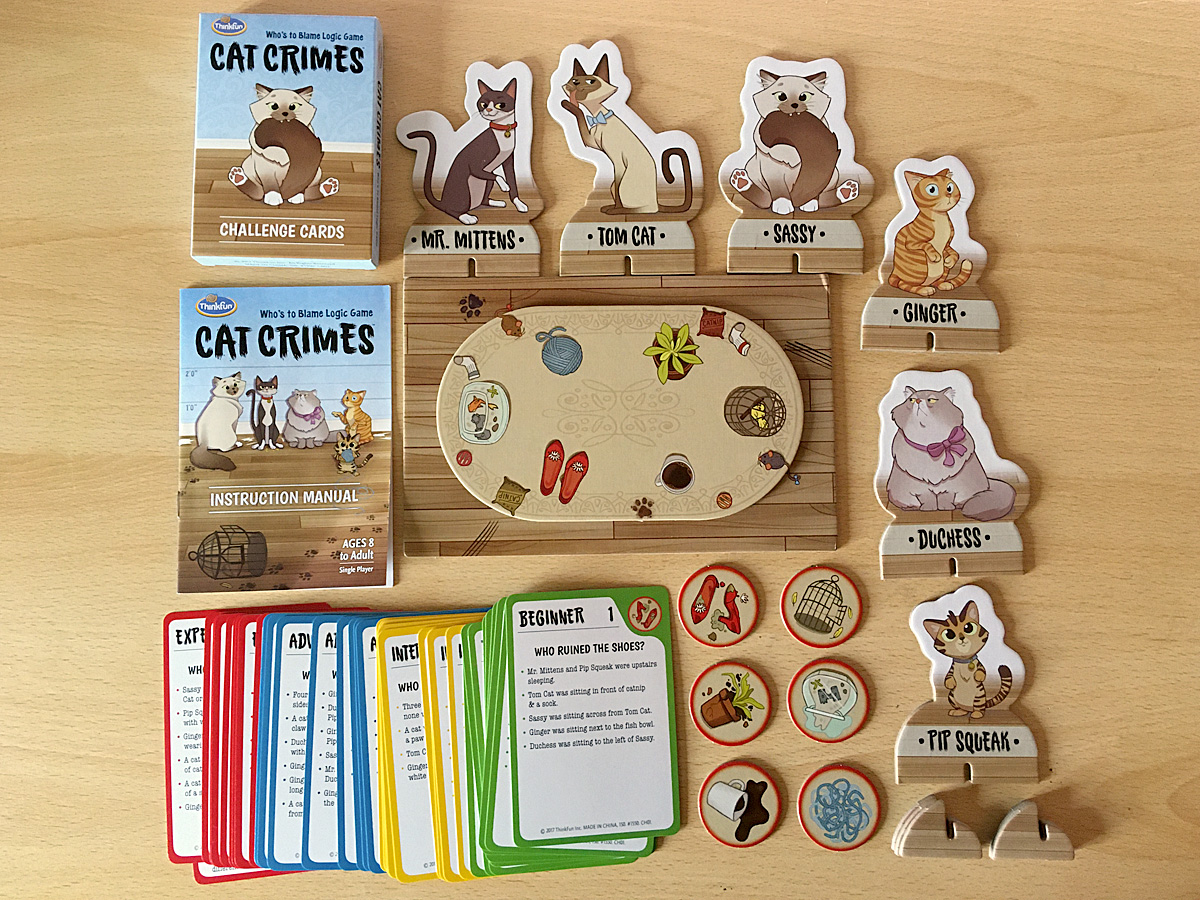 In the box, you will find a game board, six cat tokens (with stands), six crime tokens, and 40 challenge cards. There is also an instruction booklet that includes biographies of the six cats, a legend for understanding the game board, and a guide to interpreting the clues.