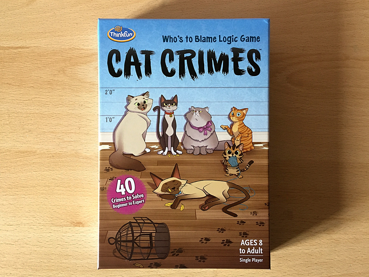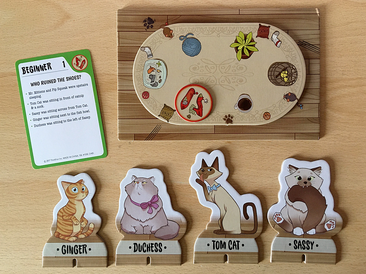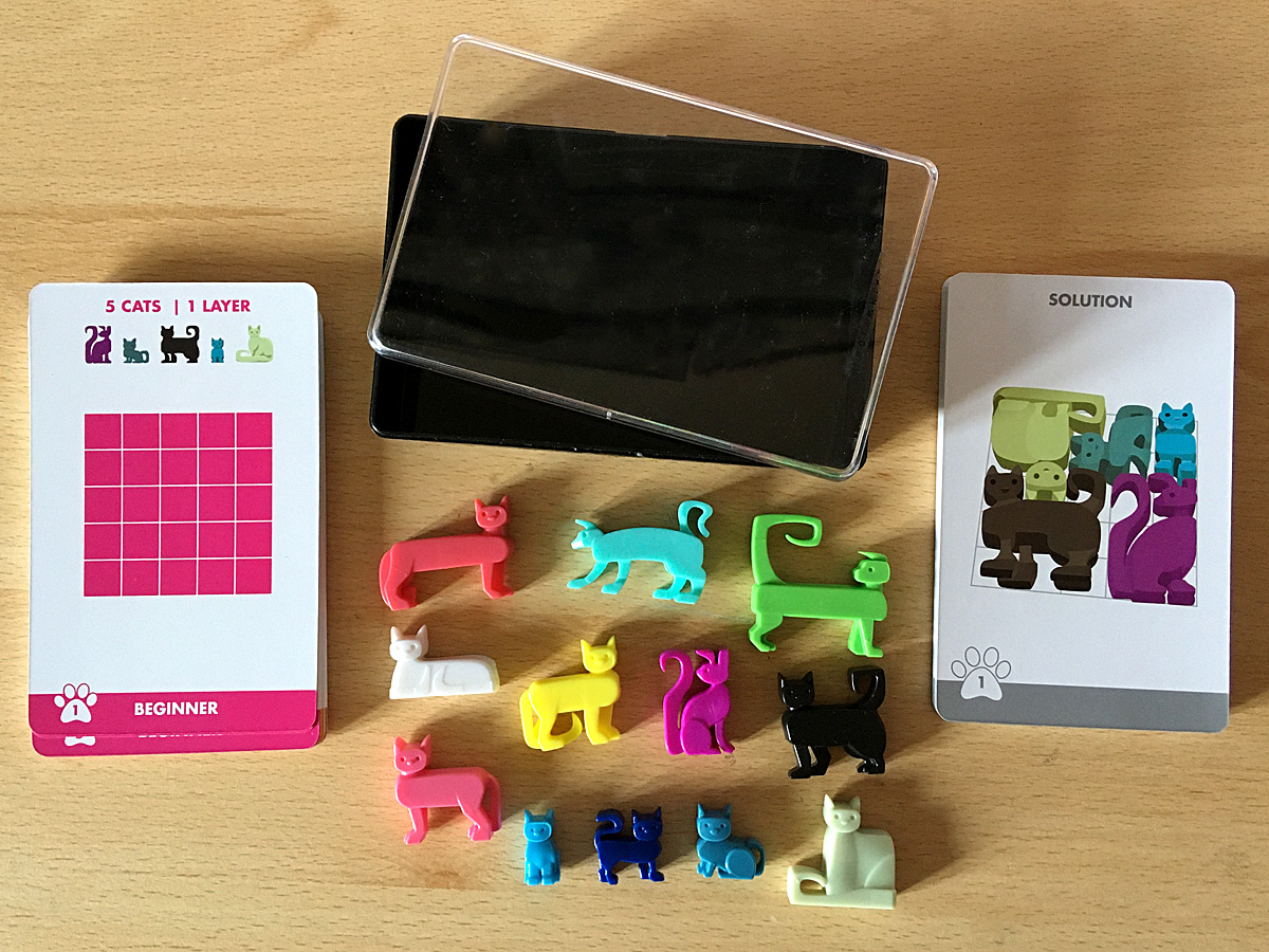 This cat-themed game comes with 12 plastic cats and 48 challenge cards with challenges starting at the beginner level and progressing through intermediate, advanced, and expert. There are also solution cards that show one possible correct answer, although there are usually several possible correct solutions for each challenge. It is packaged in a travel case that keeps all the components neatly stored together, although I would have preferred to see a more secure lid because the current one comes off very easily – especially if it was bumped around in a bag.