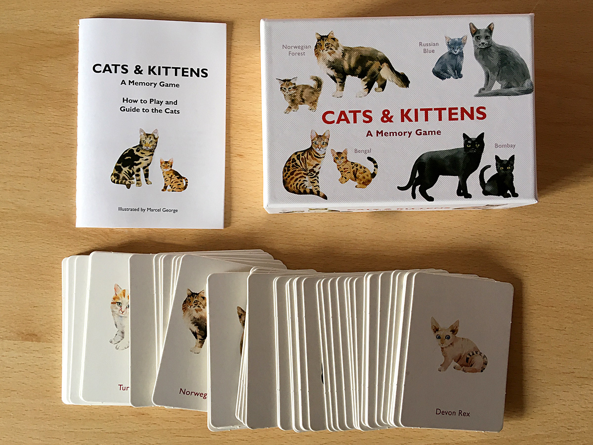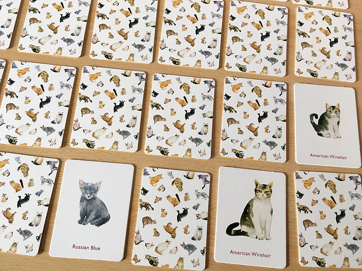 Cats and Kittens is a simple cat-themed game that can be used to play a variety of memory games. The deck features 50 cards and 25 breeds of cats, each breed getting one card featuring an adult cat and another with a kitten. The cards themselves are much thicker and higher quality than traditional playing cards – they certainly would not bend easily – and the box is well sized with no wasted space and no plastic either.
