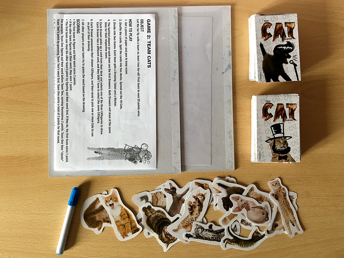 Once they have decided and told the others what category they have chosen, they must choose at least one die-cut cat to include then use the drawing board to draw a picture so that the other players can guess what was written on their card. The boards include a white cardboard base with a clear sheet over the top. The cats go under the sheet and you draw on top, so the cats don’t get any pen marks on them even if you draw right over the top of them.