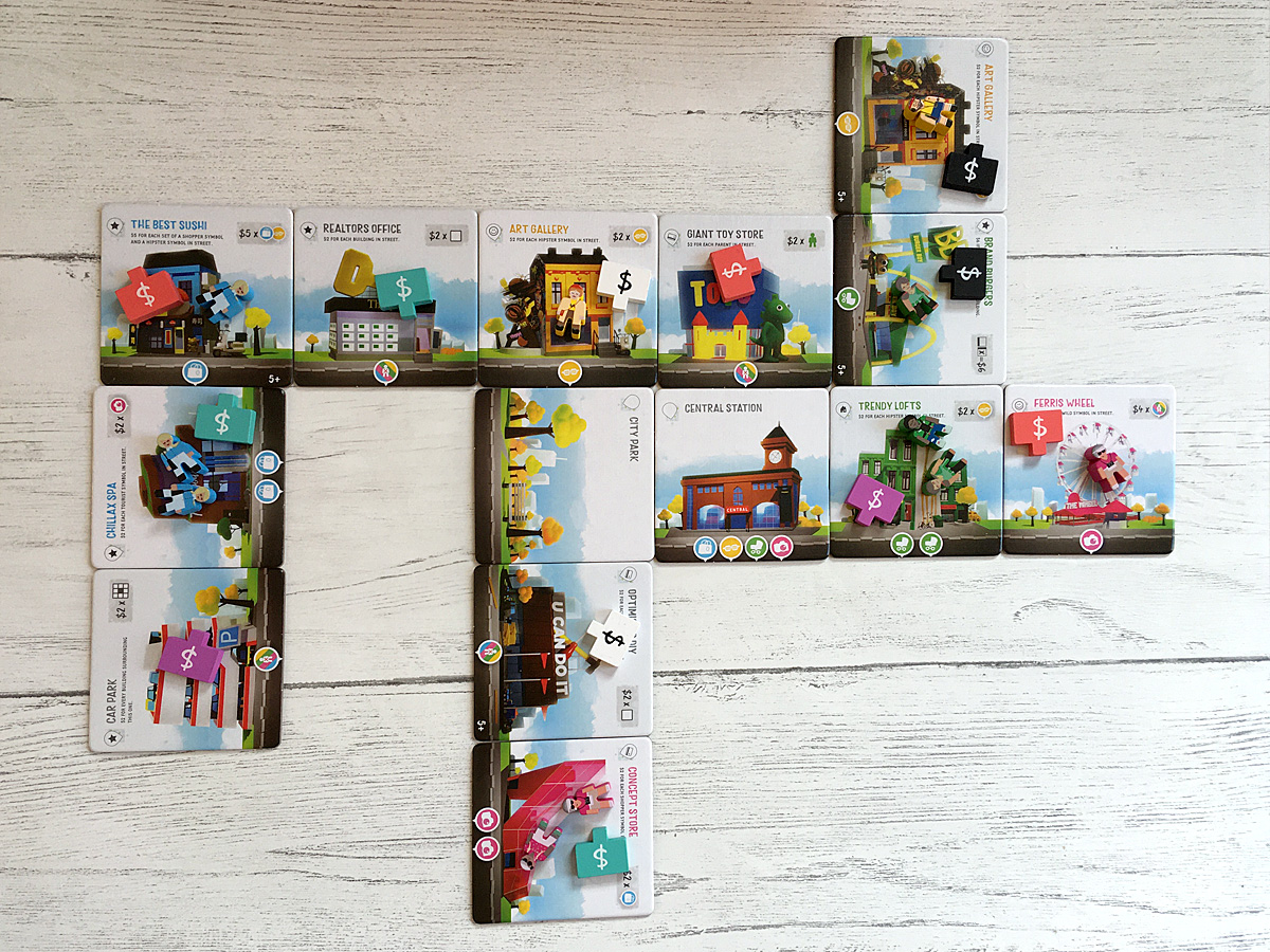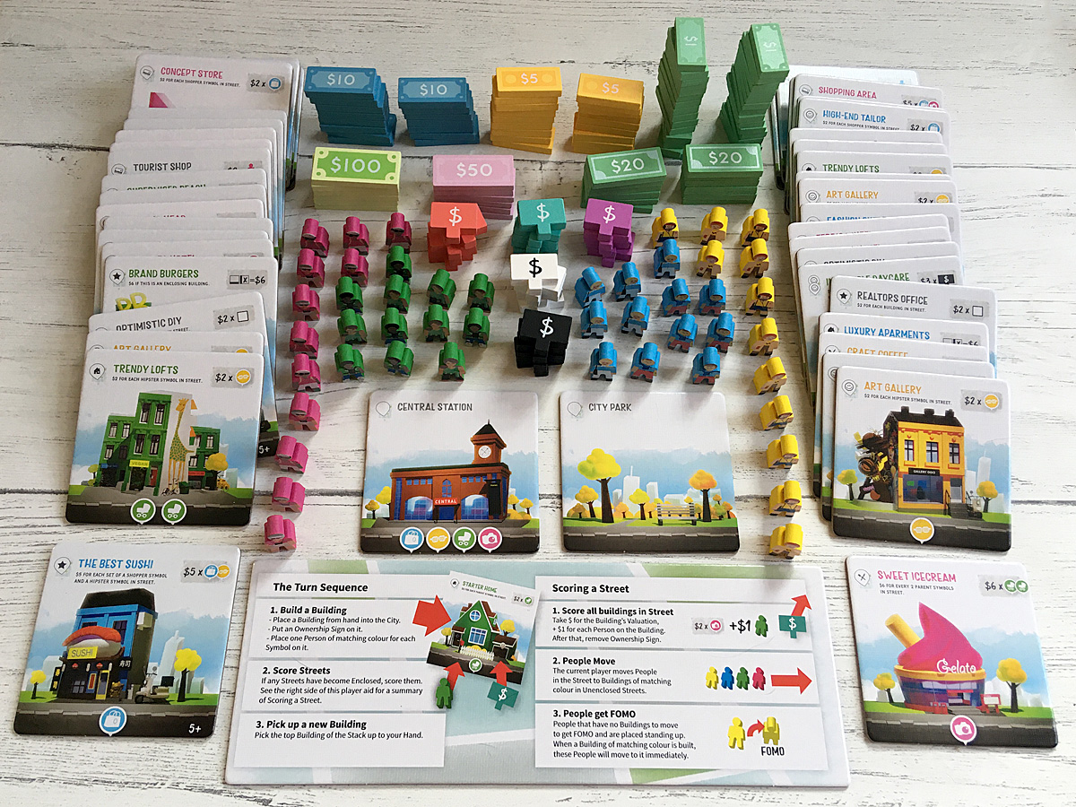 As I noted above, I particularly loved the wooden components and I truly hope this level of quality is maintained into the production copies. I appreciated the use of symbols in addition to colors on the building types, and printing designs onto the People means color-blind players shouldn’t experience difficulties identifying between the types – although I’m not sure how clear the difference between the colors of Ownership Signs will be. I did find some of the rules confusing at first, largely due to the wording in our draft copy of the rules, but hopefully, this will be cleared up prior to production. This was mostly around the Valuation of Buildings when a Street was enclosed, but we also found ourselves unsure about a few points regarding FOMO and ended up setting a house rule to finish our game.