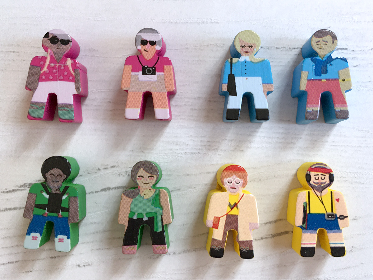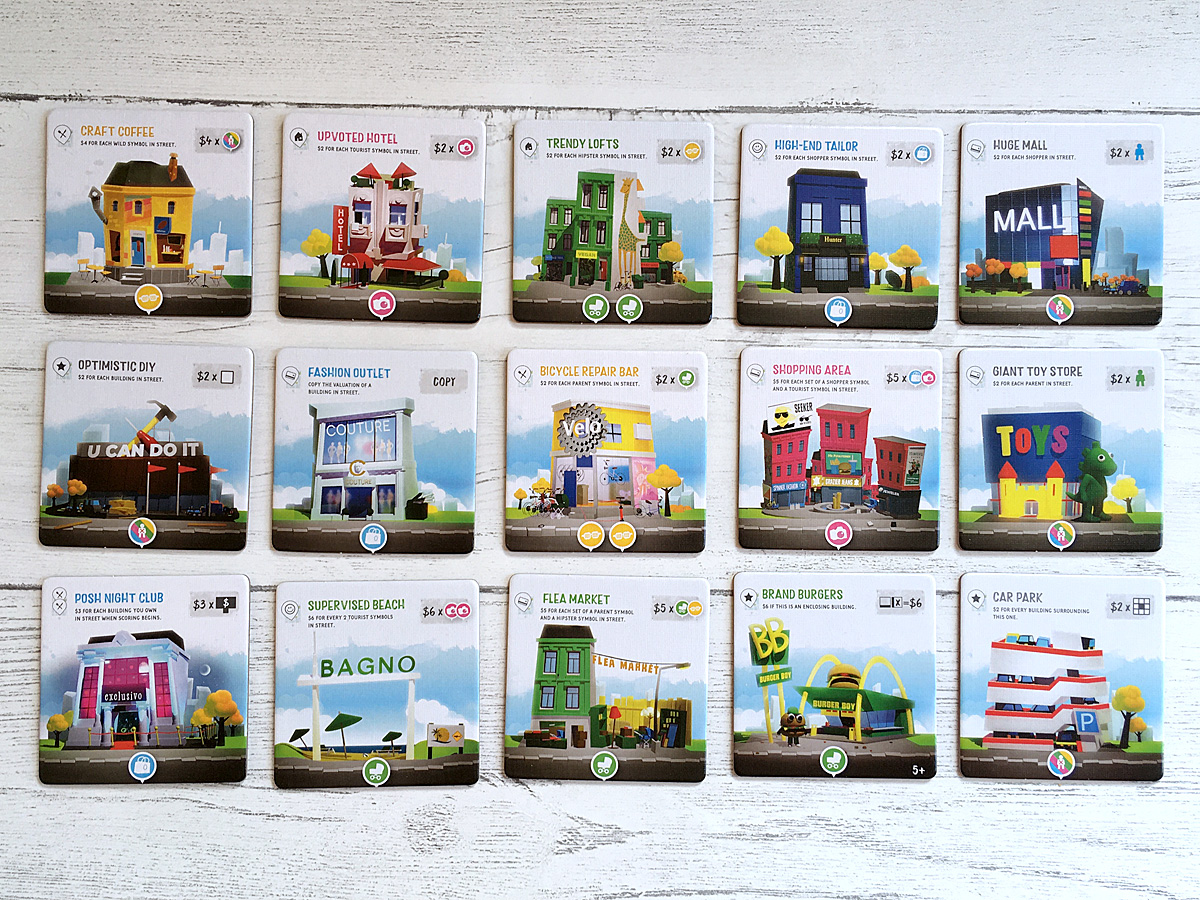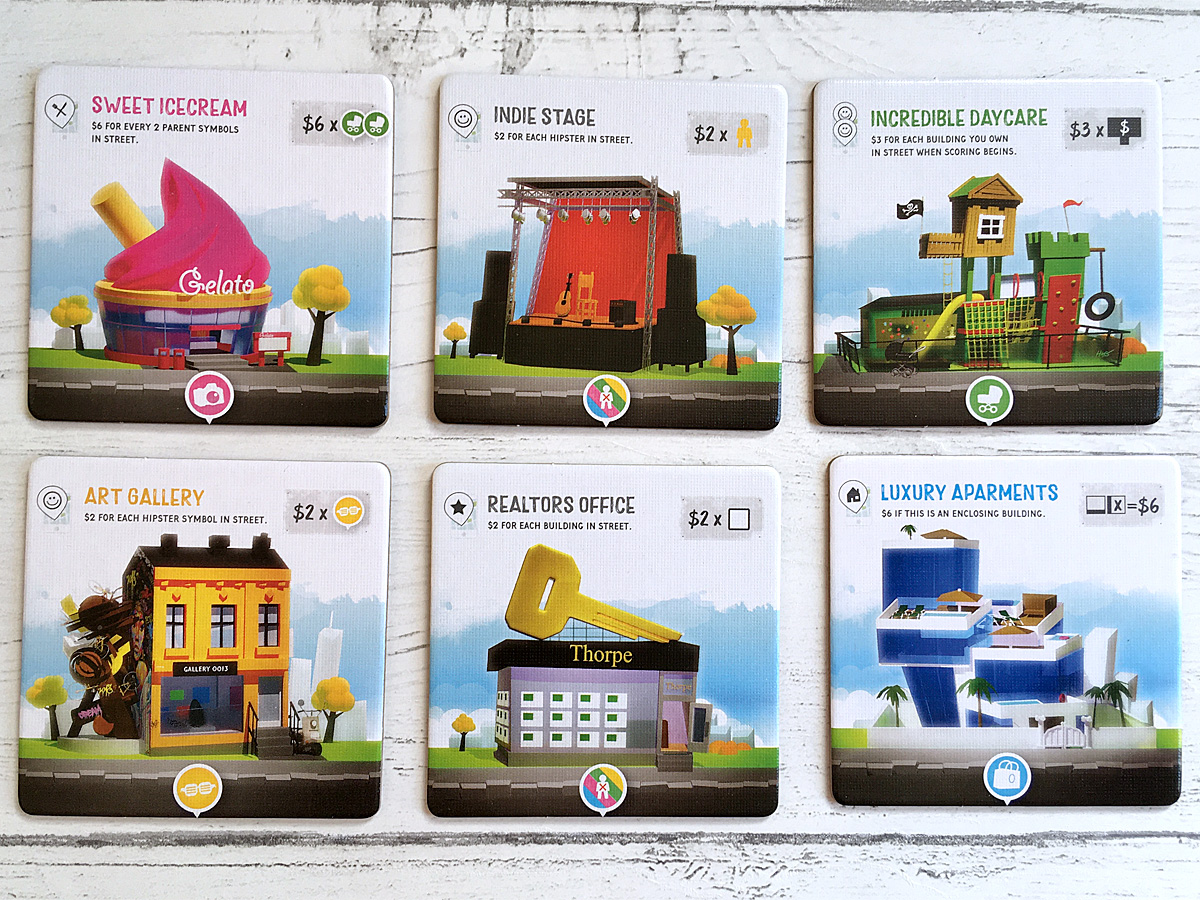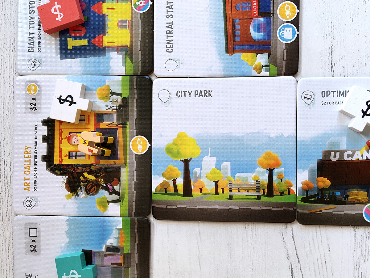 The art on the Building Tiles is cartoonish and reminded me of Dream House or an indie video game with lots of bold colors and wonky angles. The tiles are printed on thick, double-sided, glossy cardboard with clear symbols and easy-to-read text. The People are also fun and brightly colored. They have designs printed on them which makes them easy to identify between the four types even for those with color-blindness, although those designs do appear to be unnecessarily gendered which could have been avoided.