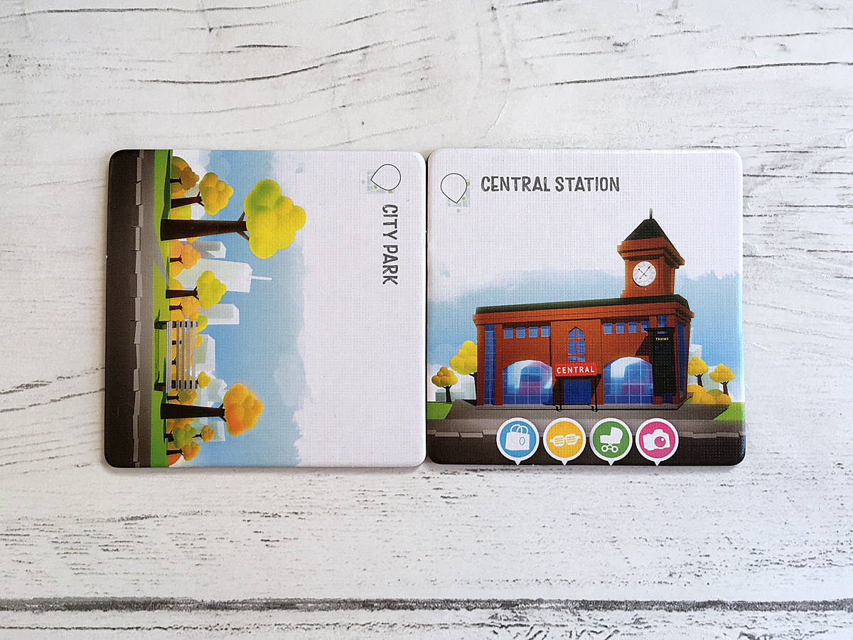 Begin by placing the Central Station tile in the middle of the playing area and placing one Person of each color on top of it, lying down. Then place the City Park tile beside it, rotated at a 90-degree angle to the station. These two tiles will form the beginning of your City.