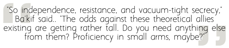 An aspect of Chaos Rising that I particularly liked was the different sides of Thrawn we got to see here. I often struggle to enjoy the Thrawn novels due to their hard sci-fi-leaning style and focus on military strategy over character exploration and development. While that is still the case here – as usual, Thrawn is given ample opportunities to show off his almost supernatural deductive reasoning skills – having the book narrated from the perspectives of the women he works beside offers a more intimate perspective. Indeed, we see Thrawn take on an almost fatherly role toward a young girl who works under his command as a sky-walker, and also see him on what could theoretically be described as a date. It is hard at times to reconcile this softer side of Thrawn with the ruthless tactician seen on Star Wars Rebels, but I appreciated the rounding of his character during these moments.