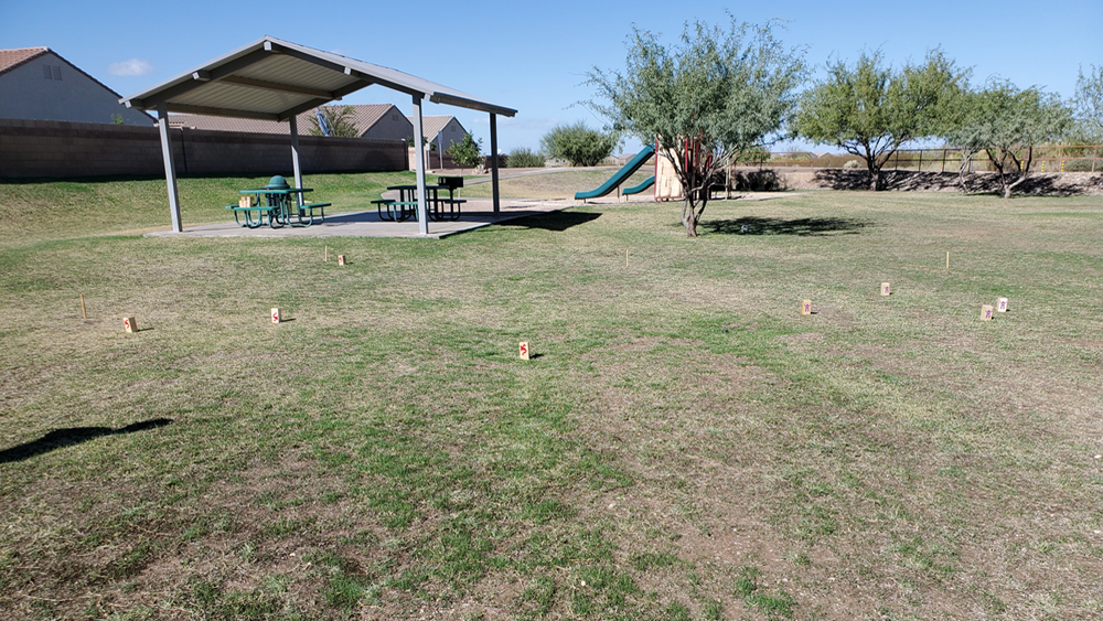 All of the actual playing pieces are made of wood and veneer which I absolutely love. The only quibble I have is that since the Wooden Stakes are wood with a pointed end, anyone with turf instead of grass in their backyard will need to find a substitute piece. Otherwise, the stakes went beautifully into the grass in our neighborhood’s little park, even though the dirt out here in the desert can be particularly brutal on stakes that are too flimsy. The Wooden Armies are just wooden skeeballs and have enough weight to do their job, but are not so heavy as to be hard for younger kinds to handle. The Armies are large blocks marked with colorful designs to designate different players/teams. The design did a great job of differentiating things by color and design across the 4 different sets so that even if you are playing a combined game, it’s easy to recognize which Castles go to which player.