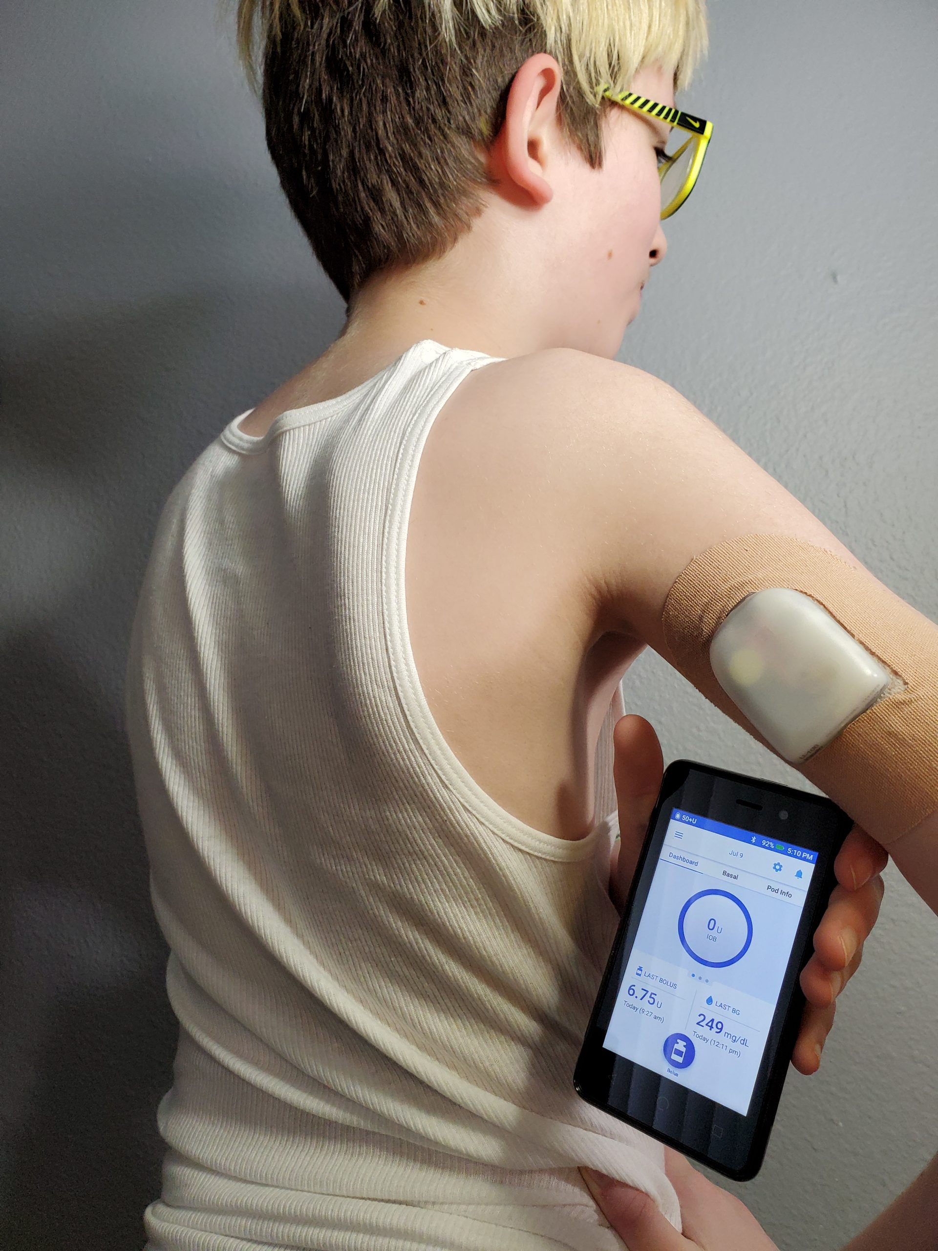 A Continuous Glucose-Monitoring Device, or CGM, is a little transmitter that is injected into the skin approximately once a week depending on which system is used. The purpose of this device is to give real-time, constant readings of an individual’s blood glucose levels. When levels are too high or low, an alarm on a phone or synced device sounds so the problem can be handled. For our son, this means most of the time he can check his phone for his current blood sugar instead of poking his finger and putting blood on a little strip. Because he has it set up on a phone, dad and I can “follow” his levels on our own phones and also get alarms—even when he is at school and we are at work. Plus, he can decorate it with stickers!