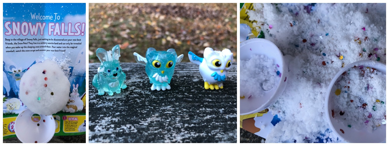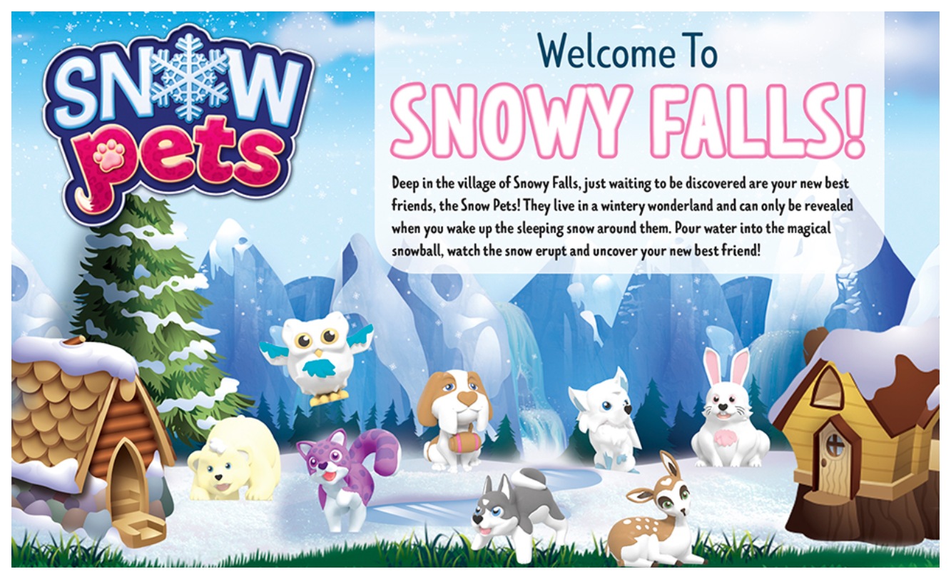 The Snow Pets come from the magical land of Snowy Falls, and each is patiently awaiting a new owner. The Snow Pet itself is contained within a snowball until awakened by adding water through the snowball’s hard shell. Once you pour the water into your snowball, a chemical reaction leads to the snowball bursting open, snow falling everywhere, and the appearance of your snow pet.