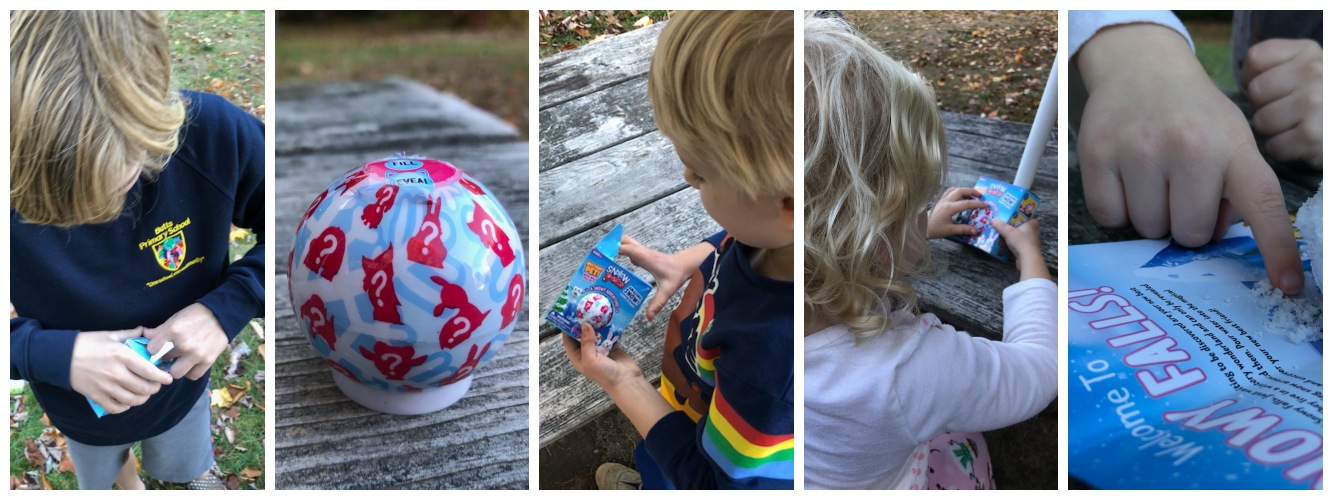 The snow itself is of course non-toxic so you don’t have to worry about any accidental ingestion, and so far it has not left a stain on any of the surfaces we have used. One word of warning. Some of our snow was left out during a rainstorm, and we soon learned a valuable lesson. The snow will continue to absorb water until it can absorb no more, at which point it becomes an entirely different beast and much harder to clean up. The snow we left outside eventually looked like something that Jabba the Hut would cough up, and no amount of dry time could restore it to it’s snowy glory. However if your kids like slime and you hate it, put your hand up with me here, then you will all love this toy. It is a great slime substitute. Much easier to work with, clean up, and so much more fun.