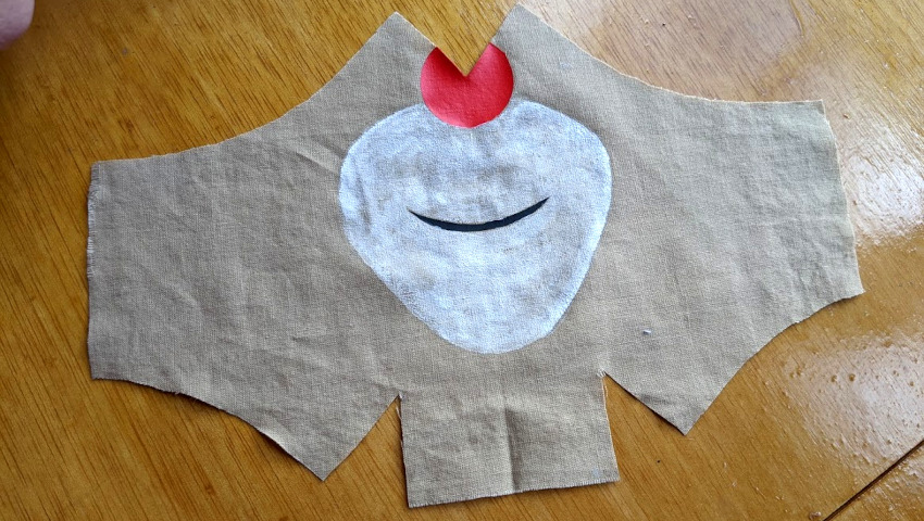 Cut out your mask layers. Make a simple reindeer face on the outer layer before sewing anything together. I didn’t have a paler tan heat-transfer vinyl (HTV), so I chose to use paint for part of the face and HTV for the nose and smile. Note that if you choose to combine these, the HTV may not stick well to fabric paint, so apply your HTV and then paint around it.