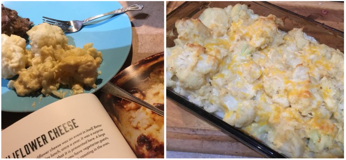 The first was the “Cauliflower Cheese.” I made this at the end of a busy day, and it was very much a case of classic “distracted cooking” on my part. I mean, I tried to screw this recipe up, with breaking up doggy battles in the middle of the kitchen, helping with homework, answering the phone… hanging up on telemarketers (don’t judge me), retrieving my Sherlock Funko that fell from the ledge into my pan, and assorted other little incidents. Still, the milk and cheese mixture was simple enough and the baking of the veggies went off without a hitch. It was practically picture-perfect when I pulled it out of the oven.