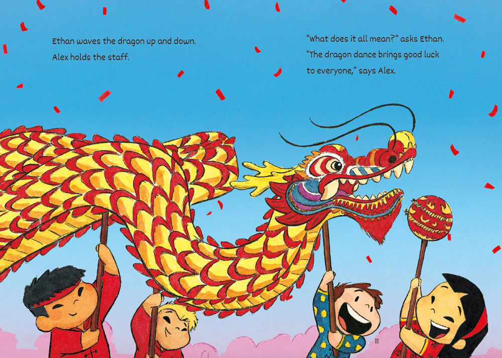 Next up in this collection is Alex’s Good Fortune by Benson Shum. In this story, a young Chinese girl named Alex invites her best friend Ethan over to celebrate Chinese New Year with her family. Ethan is not Chinese and doesn’t know the meanings behind many of the traditions, but Alex is excited to show him. Together they dance in the dragon parade, paint red banners for the door, help prepare the feast, and attend the lantern festival. Ethan even helps Alex with her least favorite part of the holiday: cleaning her room to wash away bad luck. Alex enjoys learning about the traditions and is welcomed by Alex’s family as he celebrates with them.