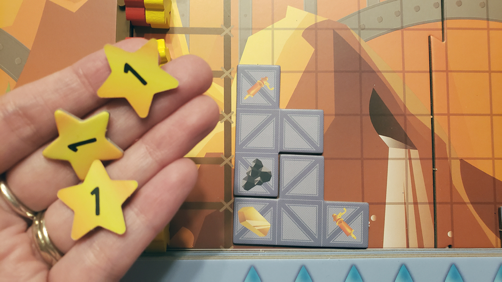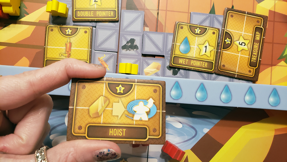 Gameplay can feel like a lot, but it really comes down to making one of two choices and following the procedure there. It did not take long for us to catch on to the turn mechanic at all. That being said, there is a lot of strategy packed into this game. Deciding when to grab Resources, when to Build, and when to Rescue or move Workers is a careful balancing act. I cannot count the number of times I thought I had a nice combination set up only to have my husband thwart me with his next move. He also had a habit of building Machines in ways that didn’t promote my Workers which is super dangerous once those Water Bars start going up (once they start going up, they go fast). I lost a lot of points to Workers in the Whirlpool and the lost opportunity for those Tower points at the end really dinged my overall score. Players also really need to keep those End Turn abilities in mind. I had a nice amount of Upgrades going on that was supplying me with quite a few benefits on my turns to the point my husband had to find ways to cut off some of those benefits. I will note that the game also took us closer to 2 hours and 30 minutes to play. I’m not sure if it was because it was our first time playing, if games played with fewer players take longer, or because we Tetris placed a lot of those early Scaffolds so nicely that it took awhile before we started raising the Water Bar and loosing Workers from our Barracks.
