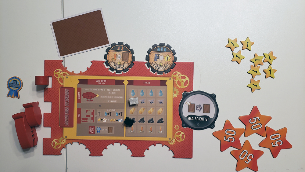 The wooden components are brightly colored and easy to identify. I really appreciate the strength and quality of wood components and these don’t disappoint in the least. The Resource Tokens (Coal, Iron, Water, Gold, Whistles) are all easy to tell apart from each other during play. The Player Tokens (Workers, Hot Air Balloon Airships, Blimp Airships, and Dreadnought Airships) are easy to tell apart from each other as well as having distinctive enough colors to tell apart from other players.