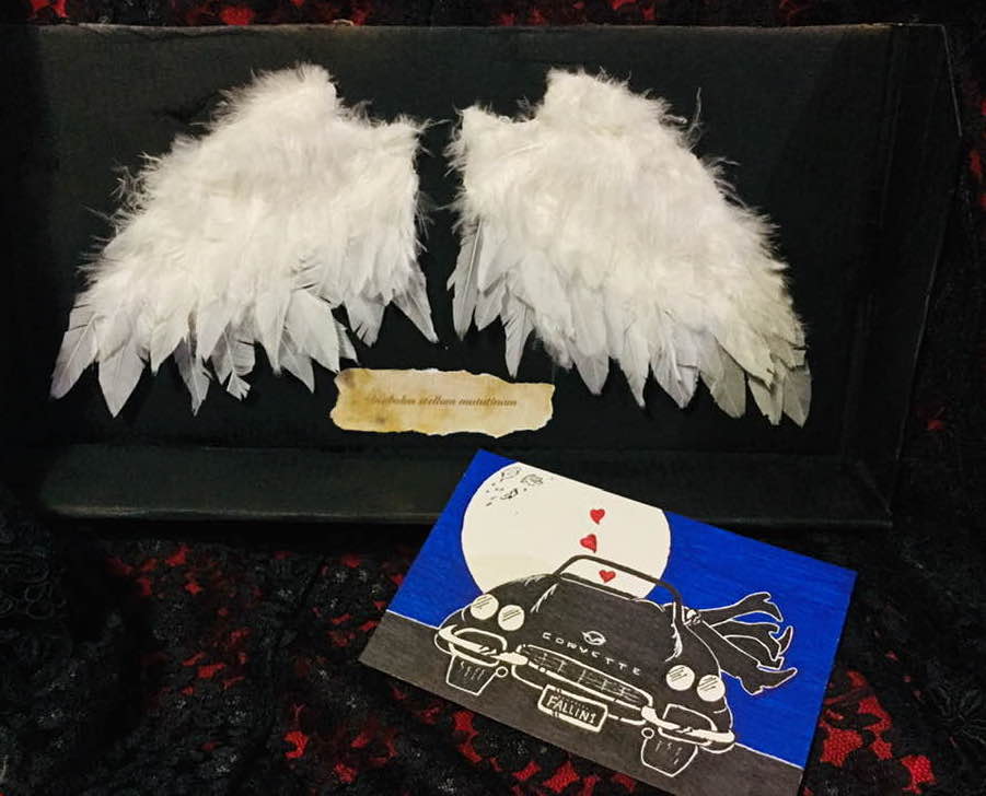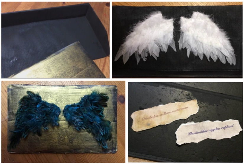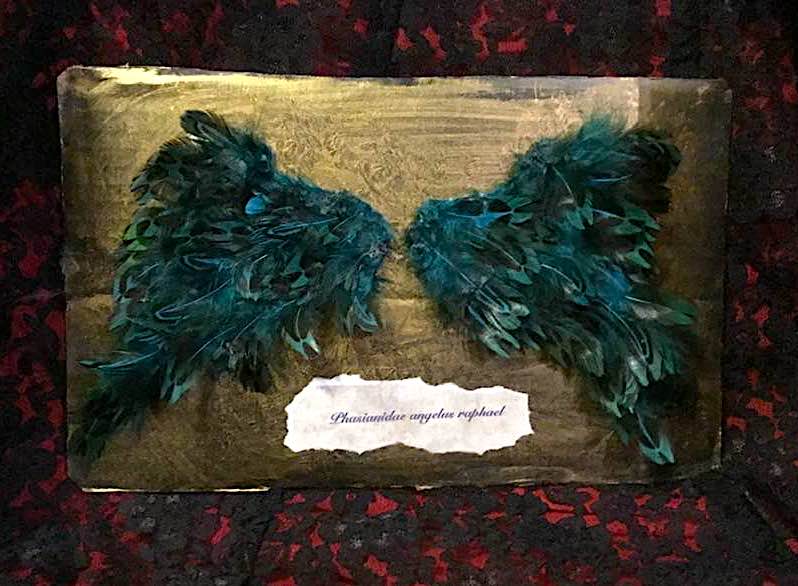 Now the wings are finished and can be mounted on the base of a shadowbox or just a flat piece of cardboard, wood, or glass for display. Whatever you think looks good. I made some goofy paper “scientific nameplates” using some bird nomenclature and half-baked Latin translations. (Lucifer’s wings I marked as Diabolus stellum matutinam.) Tear around the edges of the paper for an antique look.
