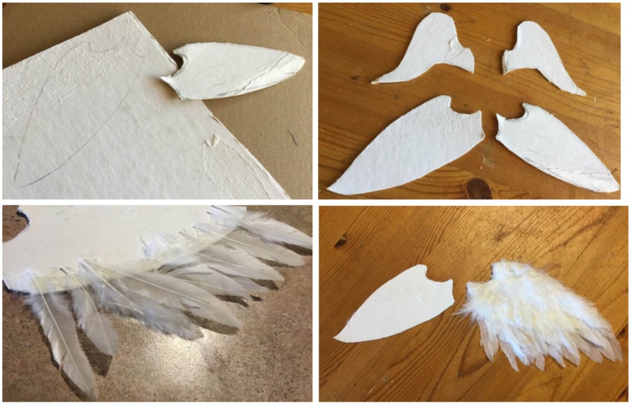 Starting with the bottom of the wings, glue a layer of larger white feathers across the bottom of the wings. Create a second later over the top, with the ends a little further back than the bottom layer. (Remember the plague doctor staff wings?)