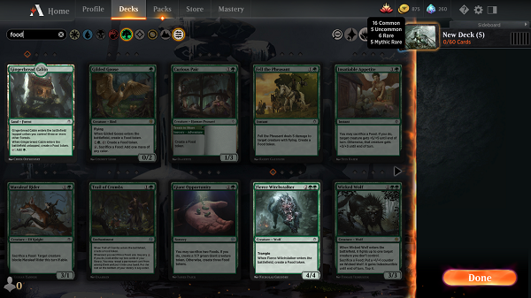 The deck we’re building calls for Enchantments and Artifacts that help create ‘Food’ tokens to feed to our creatures. Go ahead and use the search method to find other cards If you’re missing some cards to add in, or if you can’t find good replacements, look over at the sideboard and see if you have access to those cards to throw in.