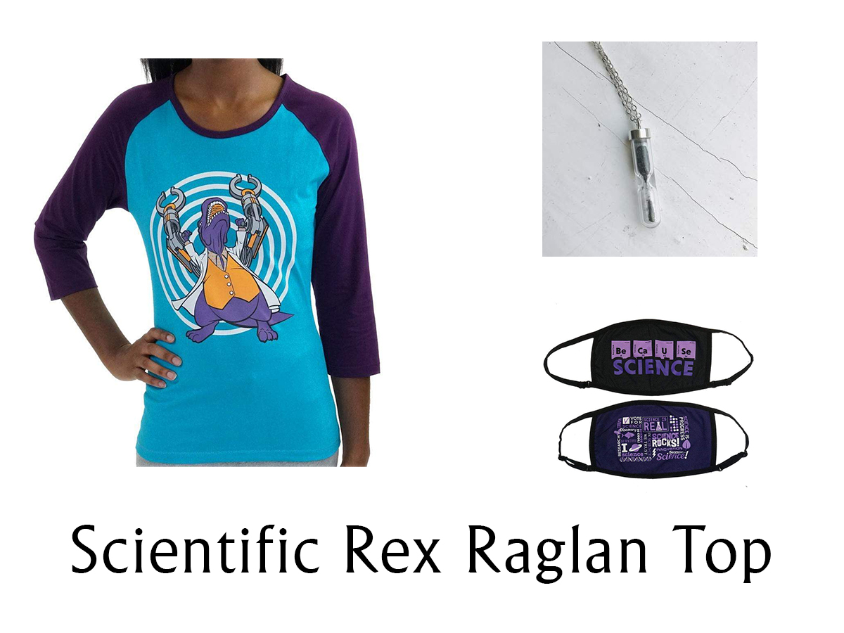 The Scientific Rex Raglan Top ($29.99) is colorful and scientifically cool. Pair it with your favorite leggings or pair of jeans for a basic daytime look. Up your game with Science Non-medical Printed Cloth Face Masks ($19.99), and my personal favorite touch, the Space-Time Hourglass Necklace with Meteorite Dust ($44.99). I find the necklace to add a bit of irony to the outfit as a whole.
