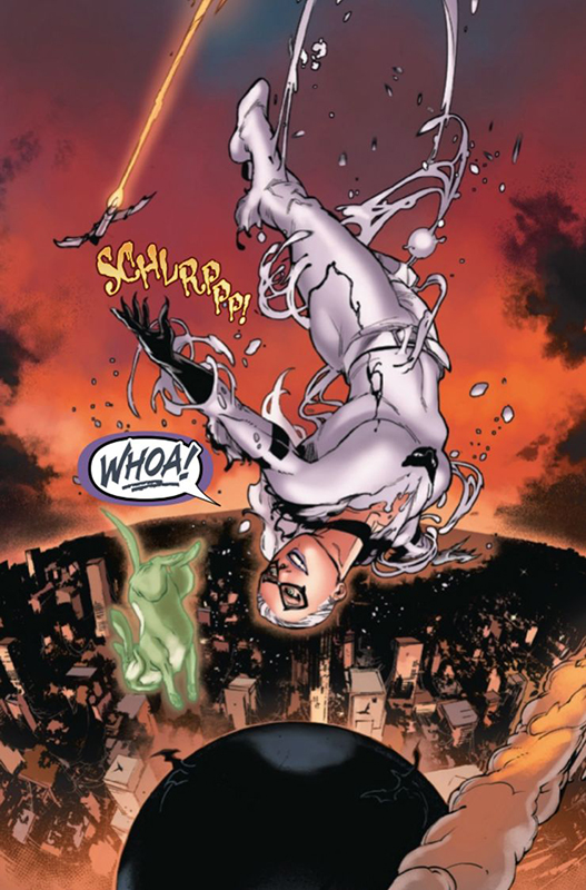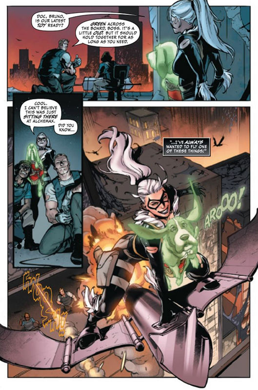 In no time at all, Felicia is ready. Packing two experimental and portable Anti-Venom suit and the ever adorable spirit hound, Bats, she springs aboard a goblin glider. Her target the massive symbiote orb, which Knull has parked atop the Chrysler Building.
