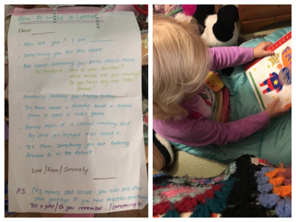 After our activity sheets we will stick to the daily schedule and work on our correspondence. Each day of the week we write to a different family member, friend, or pen-pal in Colorado (Hi GeekMom Judy!). Usually we follow a format for letter writing, so that we can all focus on our handwriting, but today we will simply write about our favorite books and what we hope to read next. And of course we will include a bookmark for everyone we write to.