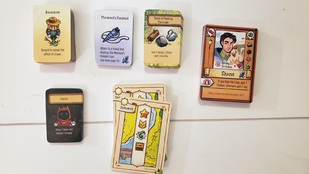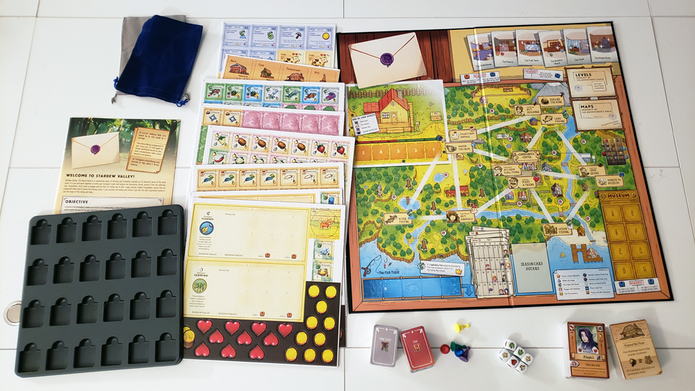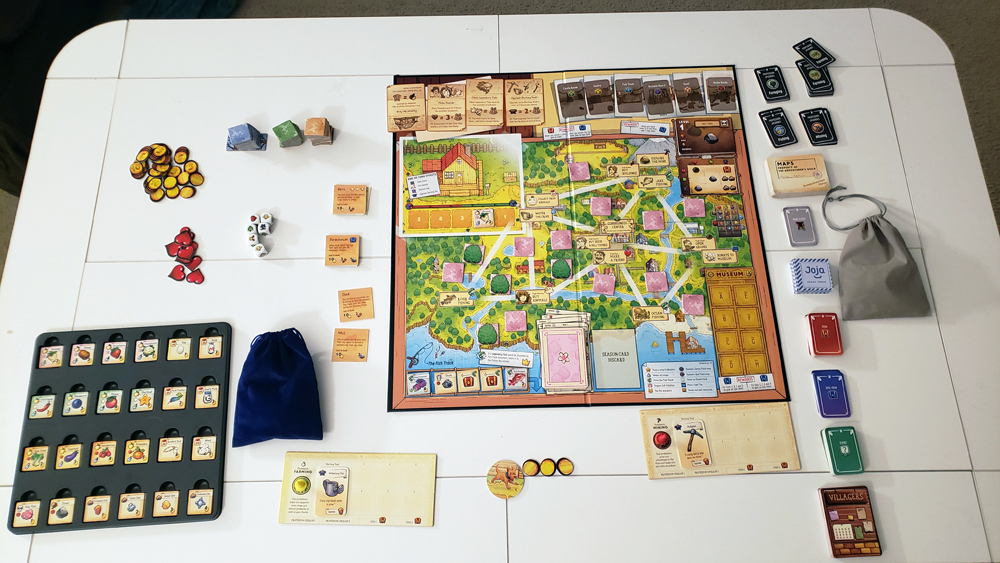 The board is large, beautiful, and certainly sturdy. It recreates the oh-so-familiar map Stardew Valley fans should easily recognize and adds in convenient places to sort a number of the tokens and cards to help organize gameplay.