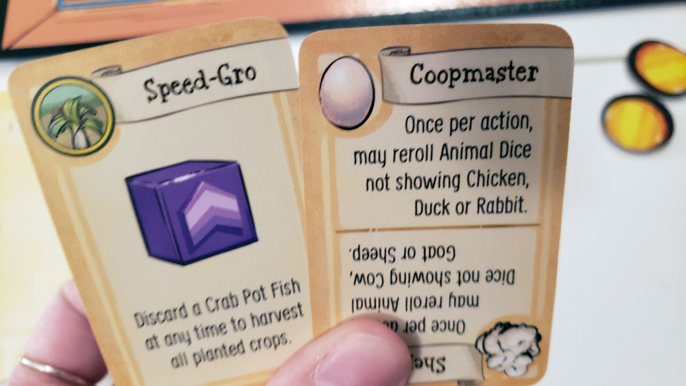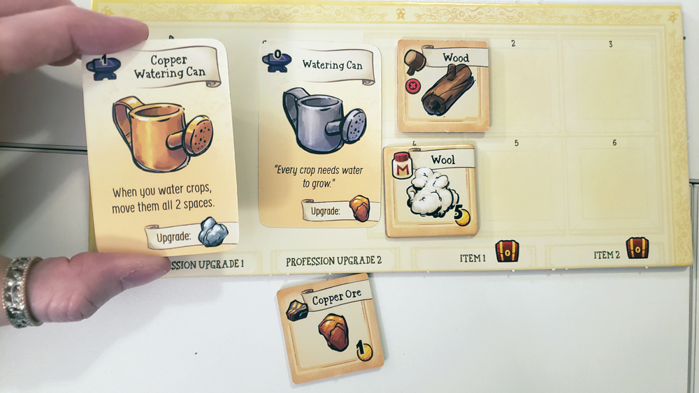 - Water Crops (Farm Action): Spend an action to move all planted Crops one space to the right. If a Crop moves off Track, it is yours as long as you have Inventory space on your Player Mat, otherwise discard an item to make room or discard the Crop.