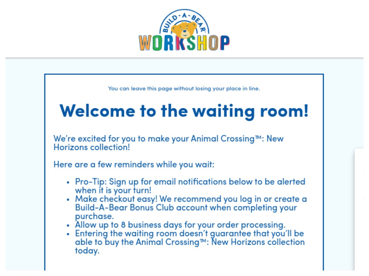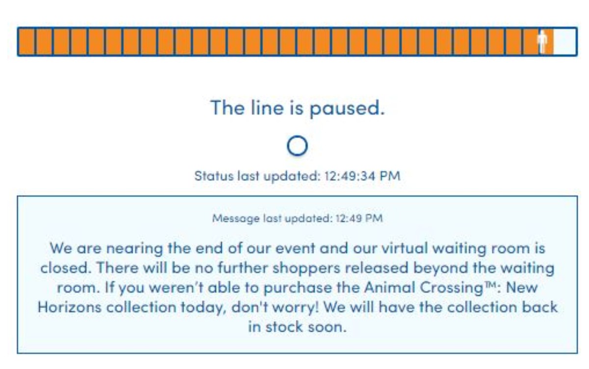 “The line is paused.” What on earth does that mean? Is the site broken? Am I next? Are they sold out? About five hours later (two or three minutes in real time) the site refreshed and I was greeted by a giant “Coming Back” banner telling me to sign up for notifications of Tom and Isabelle’s return. Sold out while I waited in line.
