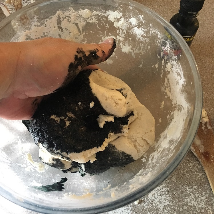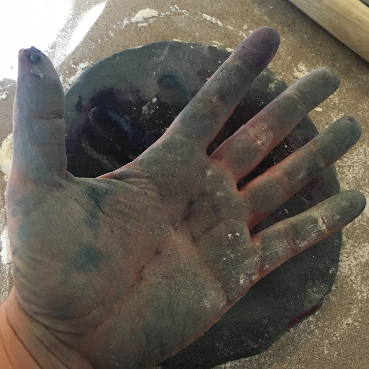 - Add whatever food coloring you want to the mix. I went for a bit of black to darken the dough, a mix of purple and blue. It didn’t quite give me the dark night sky feel I was aiming for, but it still looks nice. Plus, my hands are now stained blue/purple for the next 3-days. It happens. Feel free to add a little sparkle glitter as well.