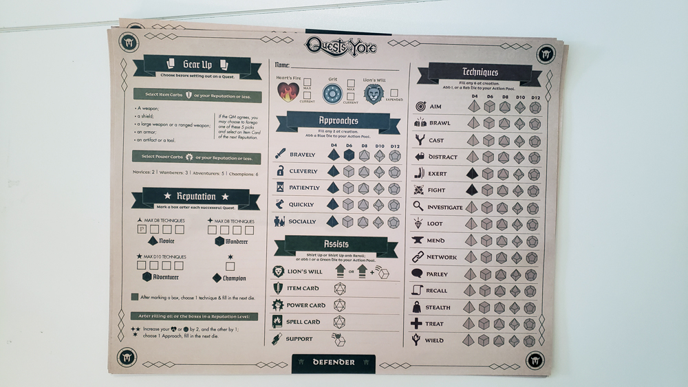 If all Characters become Exhausted (run out of Grit) by the end of the Quest, the Quest is failed and they must retry it. Otherwise, they have completed the Quest. Players then gain a Reputation box and get to add a point to a Technique (No Technique above a d8 for Novices and Wanderers though). If they rise to a new Reputation, they get to add to an Approach and choose to gain 1 Heart’s Fire and 2 Grit or 1 Grit and 2 Heart’s Fire. Additional Gear choices may open up too.