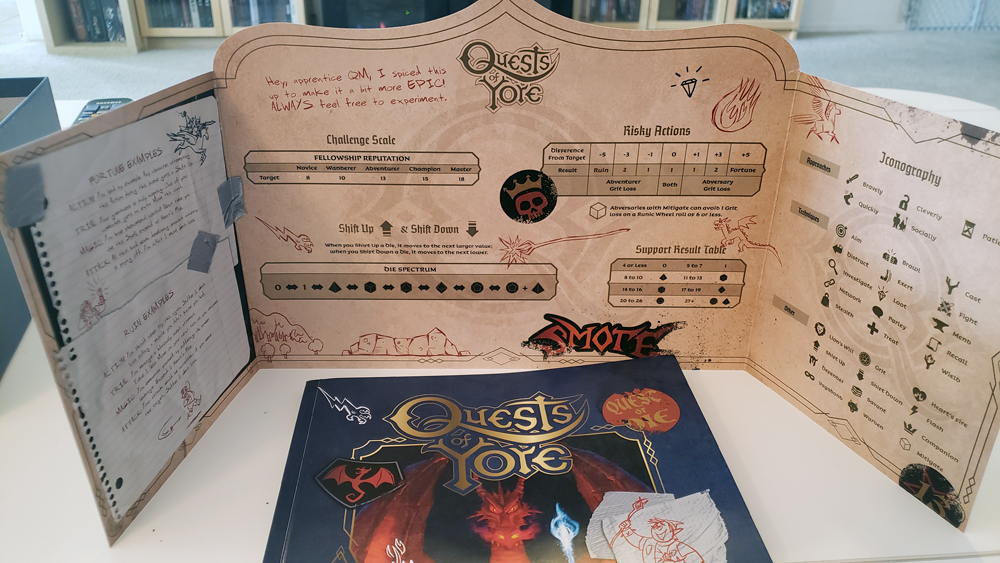 The Quest Master Shield is the typical flexible cardboard of most Game Master Shields I’ve seen before and nicely organizes the most common pieces of information a Quest Master needs to refer to.