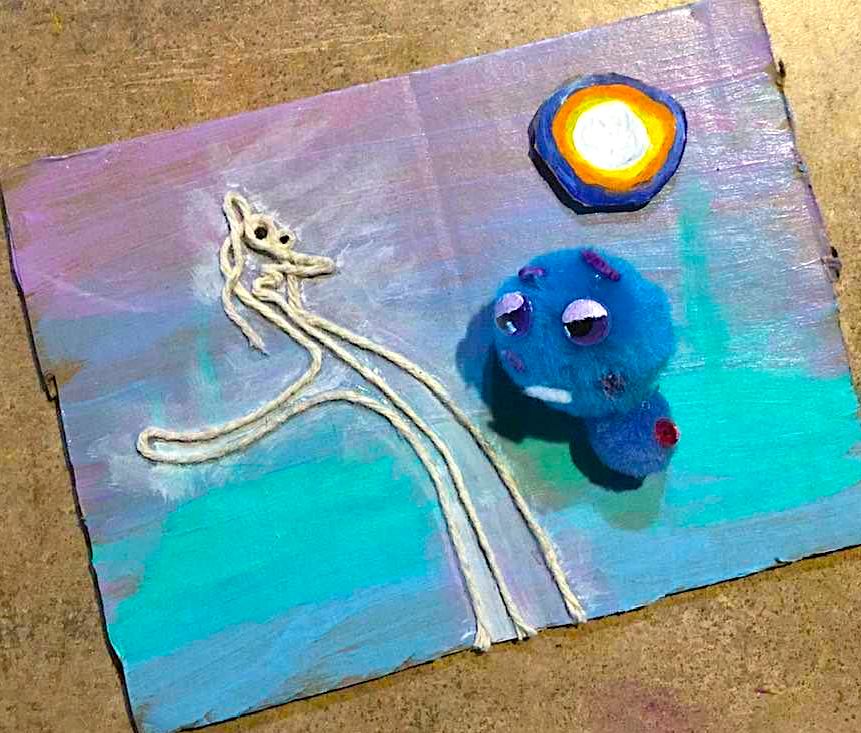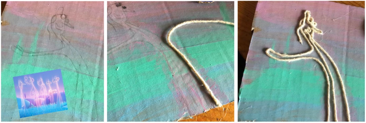 Draw the character you want (lightly) on the background surface, and little by little, glue the string over the design. Tacky glue works best for younger crafters, but I used a glue gun. Once finished, take a small black paintbrush and fill in the “eyes,” then lightly dab some white or light pink or blue paint inside the line image to give it a glow.