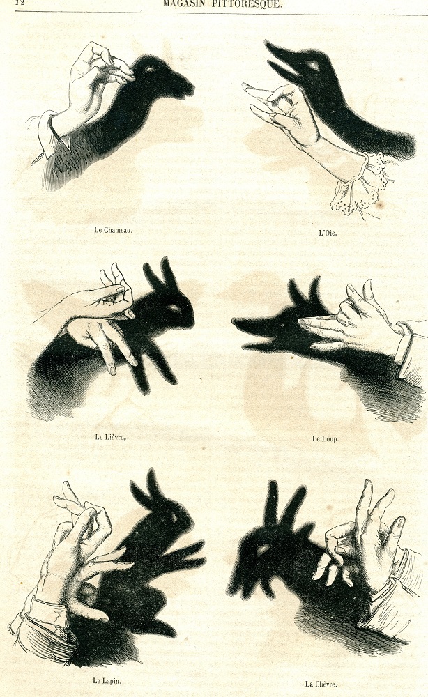 Now, I am definitely NOT the most dextrous. I could give you a plethora of excuses, but the only one you would believe is gamer thumb. However, I can achieve a semi-distant rabbit and a moderately acceptable duck. Shadowgraphy or ombromanie has been around forever, hitting its peak in the 19th century with French entertainer, Félicien Trewey.