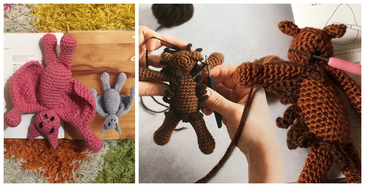 I have yet to make a bat or hedgehog in full size from the original book, but I have already made the minis version from Farm. It was nice to work on a small bat and get a feel for the technique; it makes the larger one less daunting. On the other hand, I simply loathed working the slip stitch chains required for the hedgehog. I’m not sure if my loathing will be reduced doing them on a larger project; perhaps the smallness was a hindrance to me with this stitch. However, even disliking the method, I have to admit that the end result is simply fabulous, and worth every curse word.