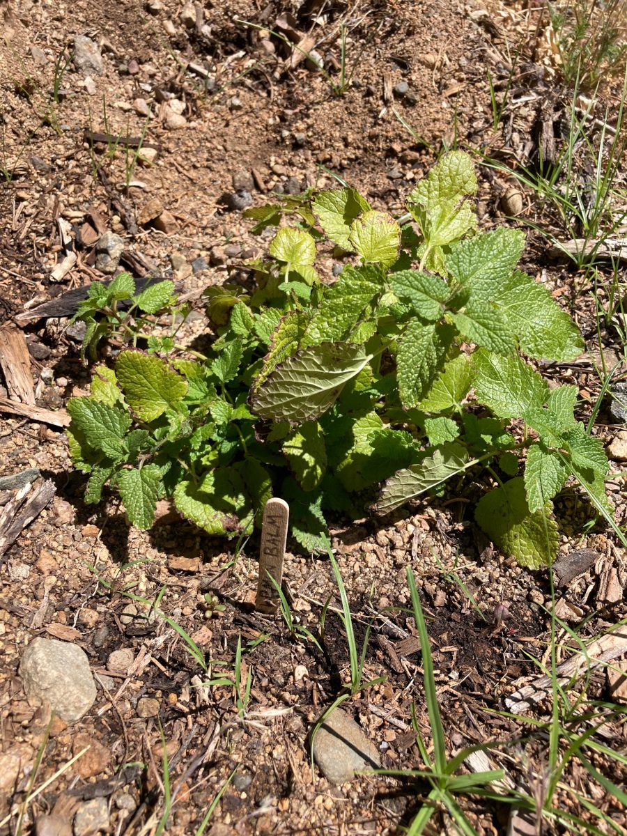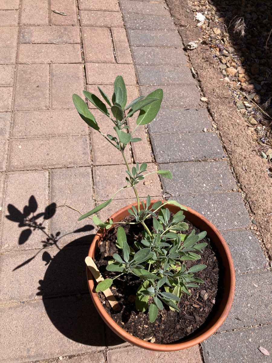 The sage grew decently indoors, but it really started taking off when we moved it outside. It got really tall, but also has tons of new growth lower down. It was in the path of the robber critter, so we put it in a medium-sided pot that we had and it’s continuing to thrive there. Once we’re sure it’s happy there, we’ll prune the height.