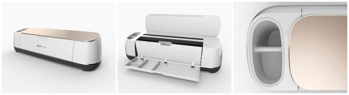 Physically more imposing than the newer Joy or my old machine, the Cricut Maker is set up for efficiency of space. With two built-in storage areas, it seeks to minimize the impact that its large footprint can have on a small crafting space. There is no way around the fact that it is an intrusive machine, but they’ve done their best to help you out with your crafting space. The first storage area is visible without opening the machine, basically a pencil holder for your tall tools, with a separate shorter holder next to it for scrapers and such. Once you open the machine, you can open the bottom leaf further to a shallow storage area, in which you can hide away your blades. As a family with multiple craft totes, I appreciate anything that comes with it’s own storage for the accoutrements of a project.