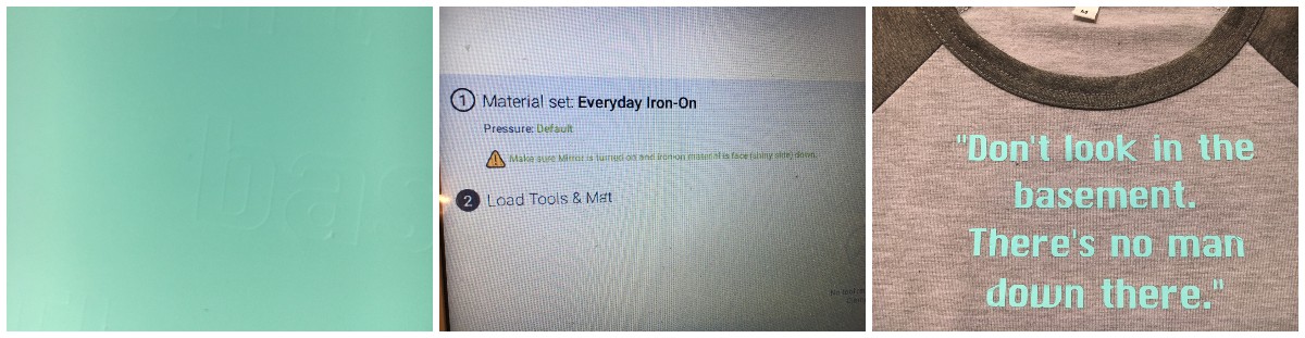An aficionado of clothing with funny expressions for myself and my kids, I knew what I wanted my next steps project(s) to be. After looking over a few more videos on cutting regular fabric vs using Cricut sheets, heat transfers, and transferal of images, I honed in on something very simple, a Cricut brand shirt, with a simple image (not shown due to copyright restrictions) and a quote from one of our favorite episodes of Bob’s Burgers.