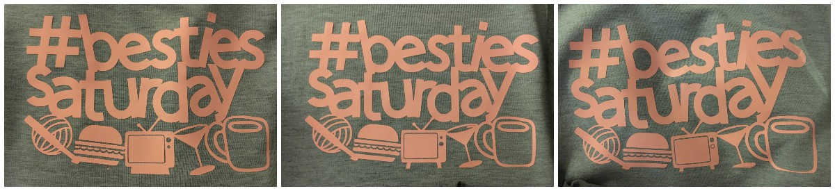 All three shirts came out just a little different, and so we are like a living “Spot the Difference” game. I also found some problems with my images that I did not foresee when selecting them. But I assume I will get better at image selection over time. At some point I expect I will even get comfortable with multiple color cuts, shock! I wanted the crochet hook to be solid, but it cut the image so that the hook was hollow. I left it in tact, but you can still see the cut line on the Vinyl. I pre-measured the vinyl to reduce waste, but even after a test cut, I lined it up incorrectly on all three attempts, thereby cutting off the bottom of the martini glass.