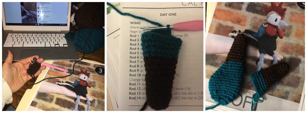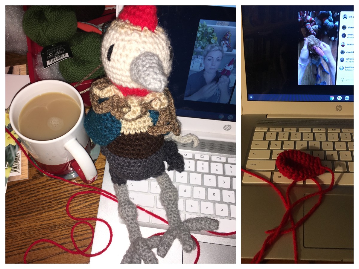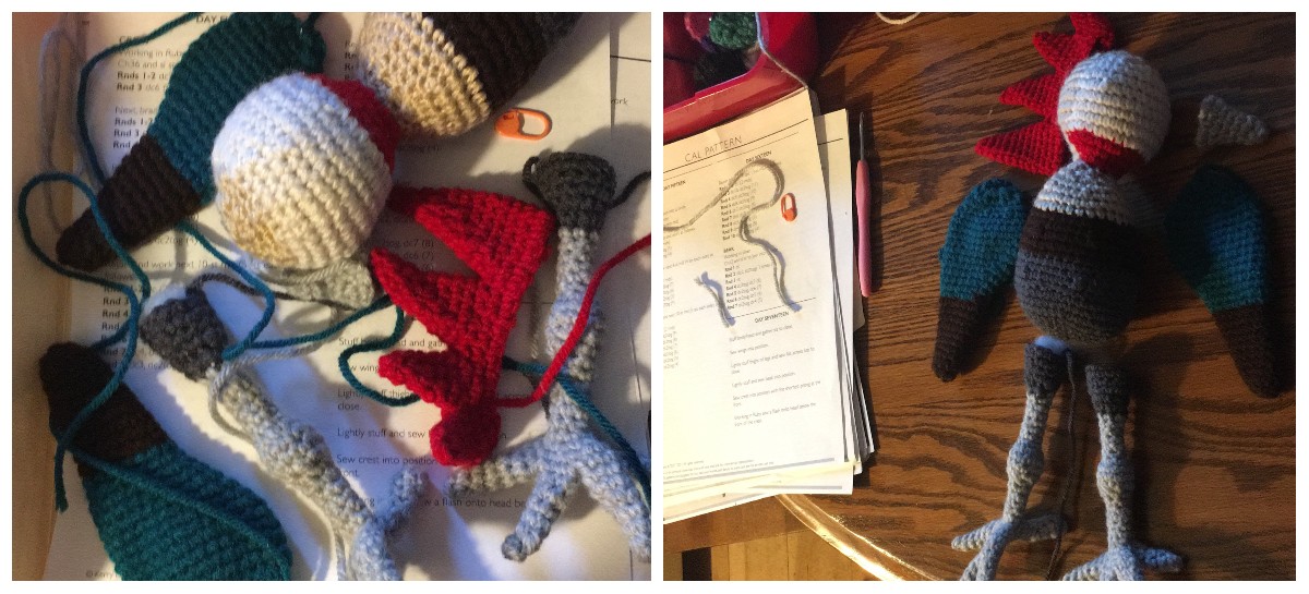 Every day for twenty days, Kerry would go live on Instagram with a play by play of the days crocheting. Some days were repeated patterns and so there was no new video, two wings, two legs, etc. For my part, crocheting along in the US, I would watch the videos at the end of the day when everyone in the UK was sleeping. This was my first bird from the Edwards Menagerie line, and I was nervous. It is a very different pattern than I am used to, with lots more detail, and many more color changes. It was nice doing it day by day. The expression may be to eat the elephant one bite at a time, but I found that by crocheting the bird one “bite” at a time I found the pattern less daunting and the new techniques easier to build on.