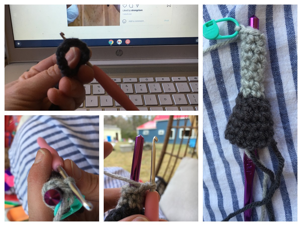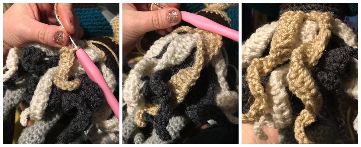 After the body, and the tremendous color changing of CAL’s face came the legs. Everyone had taken to referring to Yokohama as a cockerel by the name of CAL, though I’m not sure if this is a typical name for an animal being done during a CAL. The legs were the part that had me most worried. The slender style, the knobbly knee, the only part I felt comfortable with was the chunky thigh meat. Luckily I have already had a practice for crocheting small tubular style pieces. I use a large crochet hook inserted into the piece, to help keep track of where my stitches are, and help my Carpal Tunnel riddled hands to not get tired or achy. If you’ve ever thrown a project down in disgust due to size and frustration, this is the method for you.